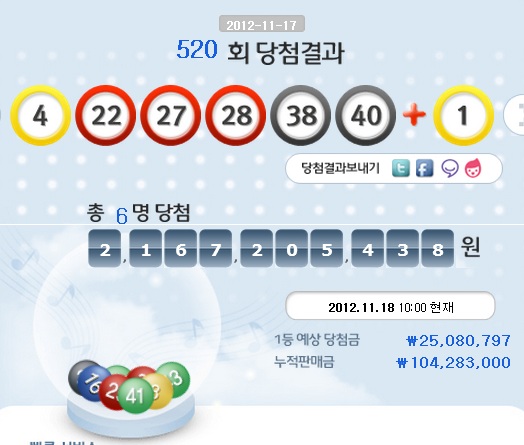제520회 로또복권을 추첨한 결과 `4, 22, 27, 28, 38, 40` 등 6개가 1등 당첨번호로 뽑혔다. 2등 보너스 번호는 `1`이다.