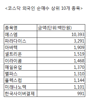 19일 코스닥 외국인 순매수 상위 10개 종목