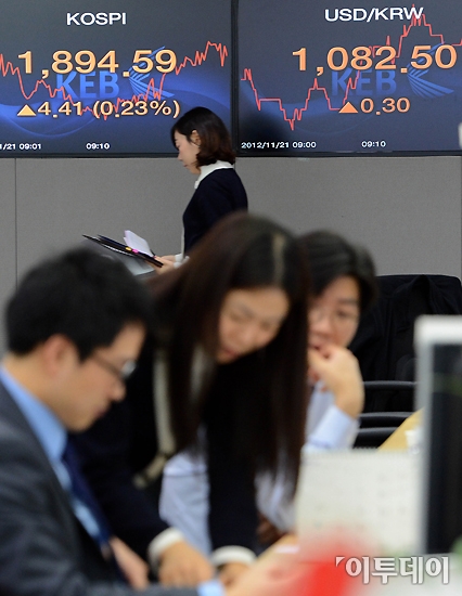 코스피지수가 외국인의 매수세에 사흘째 상승세로 장을 시작했다. 21일 오전 코스피는 전날보다 4.41포인트 상승한 1894.59를 기록하고 있다. 환율 역시 전날보다 0.30원 상승해 1082.50을 기록하고 있다. 사진은 이날 오전 을지로 외환은행 본점 딜링룸.