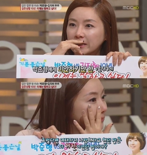 김지혜는 “박준형에게 너무 미안하다. 사랑한다는 말을 한 번도 못했다. 미안하다”라며 “내가 우울하고 상황이 싫으니까 오빠가 행복한 것도 싫었다. 난 집에서 이렇게 힘든데 왜 안 들어오냐고 전화를 하며 괴롭혔다”고 말하며 눈물을 보였다.