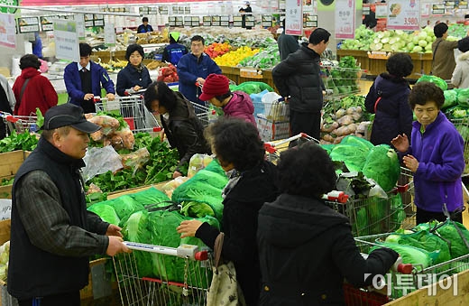 농협유통이 22일부터 2주간 25개 매장에서 '안심초특가 김장대전'을 연 가운데 23일 농협 하나로클럽 양재점을 찾은 고객들이 배추를 고르고 있다. 농협유통은 이번 행사를 통해 김장배추 한 포기를 시중의 절반 가격인 1480원에 판매한다.