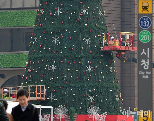성탄절을 한달여 앞둔 22일 오후 서울광장에 대형 크리스마스 트리가 설치되고 있다.