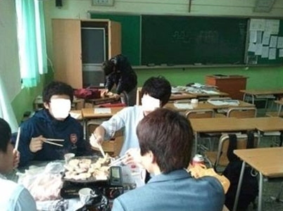 이 사진에는 학생들이 빈 교실에서 삼겹살을 구워먹고 있는 모습이 담겨있다.
