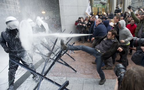 벨기에 브뤼셀 유럽의회 본부 앞에서 26일(현지시간) 유럽 낙농업자들이 경찰에게 우유를 뿌리며 시위하고 있다. 이들은 직접 트랙터를 몰고 나와 불공정한 우유 가격에 항의하며 이틀간 시위를 펼쳤다. 브뤼셀/AP연합뉴스