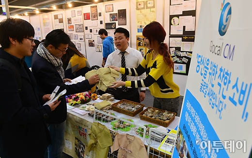 2012 청년 등 사회적기업가 페스티벌이 27일 서울 양재동 aT센터에서 열린 가운데 착한 소비 부스를 찾은 청년들이 공정무역 상품들을 구입하고 있다. ‘일파만파 젊은 사회적기업가, 꿈을 이야기하다'라는 주제로 열린 이날 행사는 사회적기업 창업가들이 직접 홍보부스존, 체험관, 쇼케이스등을 진행해 젊은 청년들이 사회적기업으로 성장하기 위해 준비해야 될 값진 기회를 제공했다.