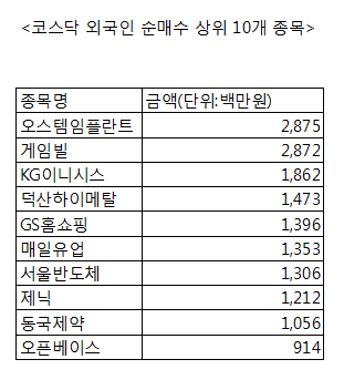 [코스닥 외국인 순매수 상위 10개 종목]