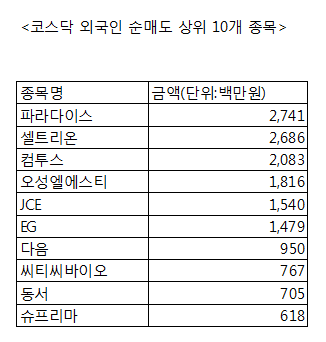 27일 코스닥 외국인 순매도 상위 10개 종목