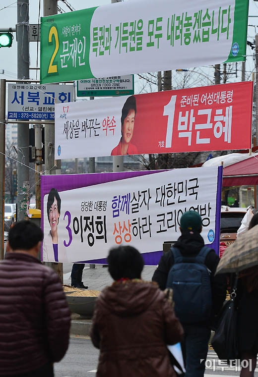 제18대 대통령 선거공식운동 이틀째인 28일 서울 은평구 새절역사거리에 대선후보들의 선고 홍보용 현수막이 걸려있다.