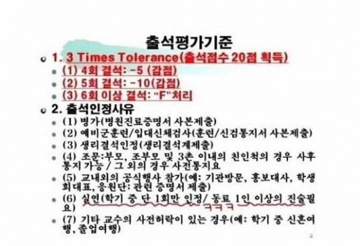 사진 내용은 한 대학 교수님의 출석점수 기준표. 이 교수님은 평범한 출석 기준을 제시하면서도 센스 있는 예외 조항들을 두었다. 바로 실연했을 경우다.