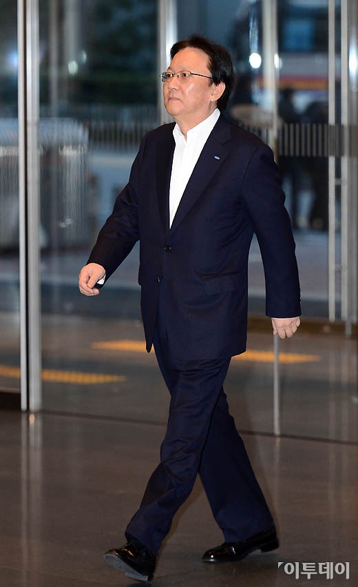 5일 서울 삼성전자 서초사옥에서 2013년 사장단 회의가 열린 가운데 부회장으로 승진한 박근희 삼성생명 사장이 출근길에 나서고 있다.