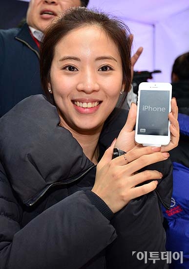 SK텔레콤이 7일 새벽 서울 강남구 논현동 플래툰 쿤스트 할레에서 애플의 아이폰5 출시 행사를 열었다. 이 날 행사에서 국내 1호 개통자 안혜진(여, 28세, 목동)씨가 제품을 수령받고 포즈를 취하고 있다.