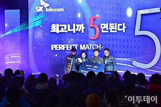 SK텔레콤이 7일 새벽 서울 강남구 논현동 플래툰 쿤스트 할레에서 애플의 아이폰5 출시 행사를 열었다. 이 날 국내 1호 개통자 안혜진(여, 28세, 목동)씨가 제품을 수령받고 포즈를 취하고 있다.