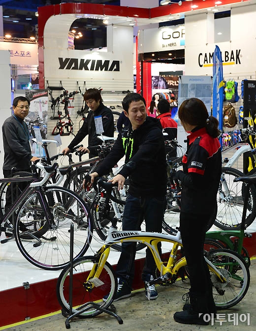 2013 서울 바이크쇼가 7일 서울 삼성동 코엑스에서 열린 가운데 참가자들이 다양한 자전거를 살펴보고 있다.