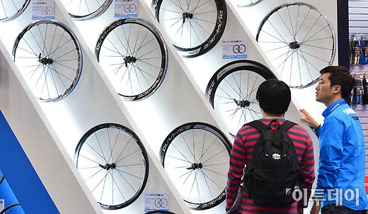 2013 서울 바이크쇼가 7일 서울 삼성동 코엑스에서 열린 가운데 참가자들이 다양한 자전거 바퀴를 살펴보고 있다.
