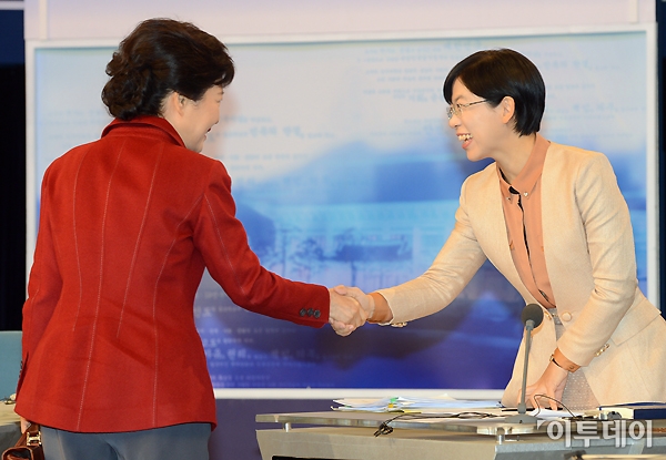 제18대 대통령선거가 9일 앞으로 다가온 10일 오후 박근혜 새누리당 대선 후보와 이정희 통합진보당 대선 후보가 여의도 KBS스튜디오에서 진행된 2차 TV토론에 앞서 인사를 나누고 있다