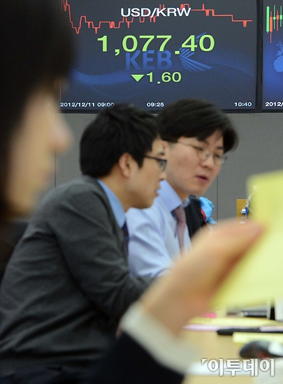 원달러 환율이 지난 10일 15개월만에 1080원선 밑으로 떨어진 후 이틀 연속 하락세다. 11일 오전 원달러 환율은 1.60원 내린 1077.40을 나타내고 있다. 사진은 이날 오전 을지로 왼환은행 본점 딜링룸.