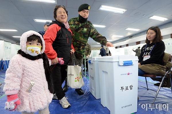 제18대 대통령선거 부재자 투표가 시작된 13일 오전 서울 용산구보건분소에서 군인 등 유권자들이 투표를 하고 있다.