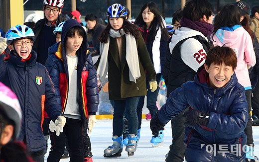 포근한 겨울날씨를 보인 16일 서울광장 스케이트장을 찾은 시민들이 스케이트를 타며 겨울을 만끽하고 있다. 서울광장 스케이트장은 일~목요일은 오전 10시~오후 10시, 금.토요일과 공휴일은 오후 11시까지 1시간 연장 운영한다.