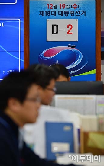 제18대 대통령선거를 이틀 앞둔 9일 오전 경기 과천시 중앙선거관리위원회에 마련된 선거종합상황실에서 직원들이 분주한 모습을 보이고 있다.