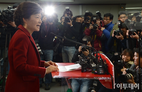 제18대 대통령선거를 하루 앞둔 18일 오전 박근혜 새누리당 대선 후보가 여의도 새누리당 당사에서 기자회견을 갖고 있다.