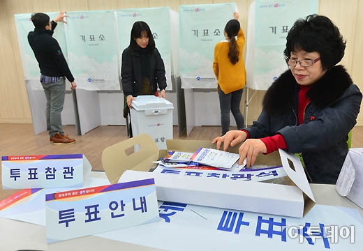 제18대 대통령선거를 하루 앞둔 18일 서울 동대문구 휘경2동 주민센터에서 직원들이 투표소를 설치하고 있다.
