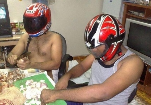 공개된 사진에는 두 남자가 상의를 탈의한 채 오토바이 헬멧을 착용하고 열심히 양파를 다듬는 모습이 담겨있다.