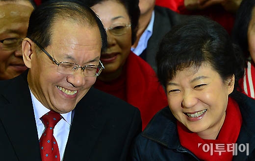 제18대 대통령 당선이 확실시되는 박근혜 후보가 19일 오후 서울 여의도 새누리당사에서 황우여 대표와 함께 미소짓고 있다.