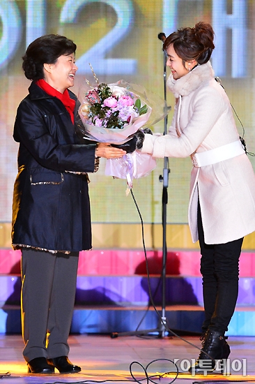 박근혜 제18대 대통령 당선인이 19일 오후 서울 광화문 광장에서 대통령 당선 축하 꽃다발을 받고 있다.