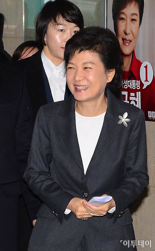 박근혜 제18대 대통령 당선인이 20일 서울 여의도 새누리당사에 들어서며 미소짓고 있다.