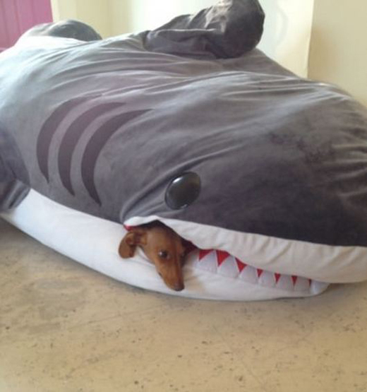 사진 속에는 커다란 상어 모양의 쿠션이 담겨있다. 그리고 상어 쿠션의 입속에는 편안한 자세를 취하고 있는 개 한마리가 고개를 내민채 휴식을 취하고 있다.