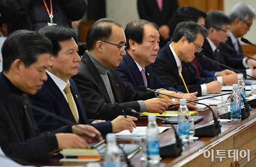 21일 서울 세종로 정부중앙청사에서 열린 국가정책조정회의에 참석한 장·차관들이 진지한 표정으로 모두발언을 듣고 있다.