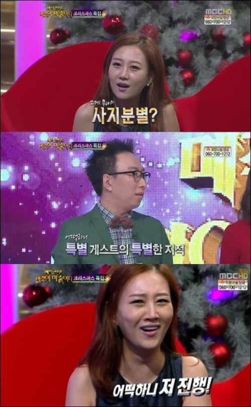박명수의 잘못된 사자성어 사용에 장윤정은 "사지분별? 저 진행 어떡하니?"라며 박명수의 진행을 지적해 주변을 즐겁게 했다.