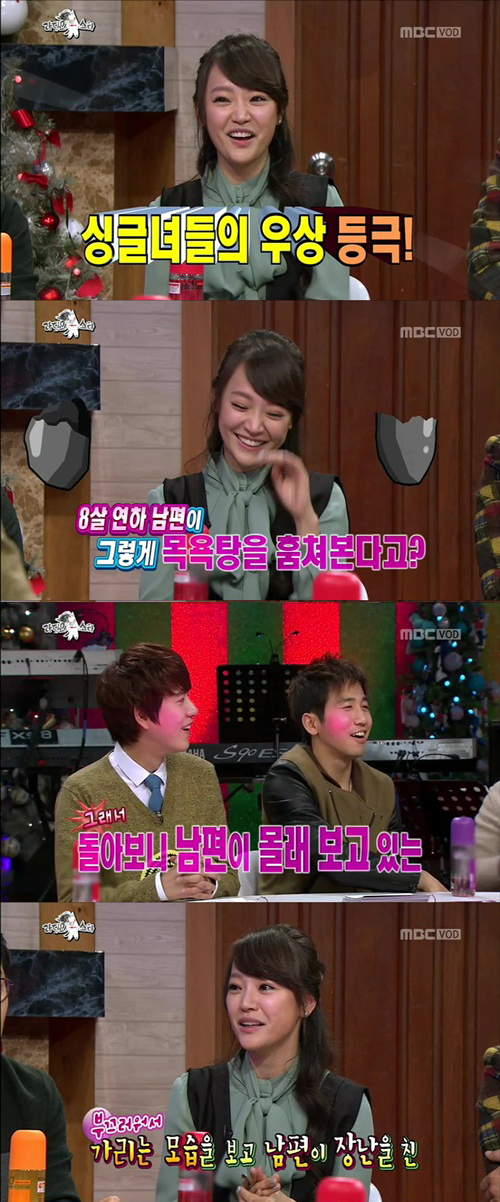 이날 방송에서 진행자들은 남편 손준호가 샤워를 할 때 훔쳐본다던데 사실이냐고 짖꿎게 물었다.