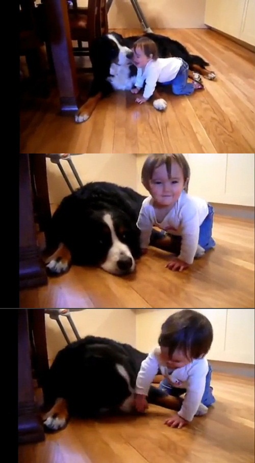 영상 속에는 커다란 개가 아이의 괴롭힘에도 싫은 기색 없이 아이를 돌봐주고 있다. 개가 핥으면 아이는 간지러워하면서 즐거워하는 모습이 네티즌들의 시선을 사로잡는다.