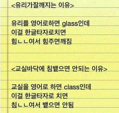 게시물에는 유리가 잘 깨지는 이유를 영어 단어 ‘glass’에서 찾으라는 내용이 담겨 있다. 유리를 영어로 하면 ‘glass’인데 이 단어를 한글타자로 입력하면 ‘힘ㄴㄴ’가 된다는 것이다. ‘ㄴㄴ’은 ‘노노(No No)’를 가리키는 인터넷 줄임말로 ‘힘ㄴㄴ’는 힘을 주면 유리가 깨진다는 의미다.