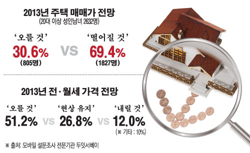 20대 이상 성인남녀 2632명(자택소유자 1415명·전·월세 거주자 1217명)중 전체의 69.4%(1827명)가 올해 집값이 더 떨어질 것이라고 전망했다. 모바일 설문조사 전문기관 두잇서베이의 2013년 집값-아파트값 등 주택매매가 전망을 물은 결과다. 반면 올해 집값이 오를 것이라는 응답은 30.6%(805명)에 머물렀다. 특히 집값 하락 예상 응답자들 중 37.4%는 '적어도 향후 3년 이상 지속적으로 하락할 것'으로 내다봤다.