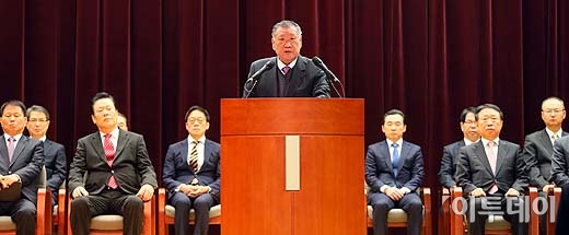 현대자동차그룹 정몽구 회장이 2일 오전 서울 양재동 본사에서 열린 2013년 시무식에서 신년사를 하고 있다. 신년사에서 정회장은 2013년 그룹 경영방침을 '품질을 통한 브랜드 혁신‘으로 제시하고, 질적인 성정을 통해 내실을 강화하는 한편 미래 경쟁력 확보를 위해 전 임직원의 역량 결집을 당부했다.