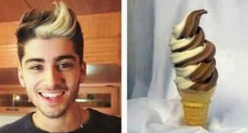사진 속에는 한 외국인 남성이 소프트 아이스크림과 모양 및 색상이 비슷한 머리모양을 하고 있어 눈길을 끈다. 이 남성의 머리는 초코와 바닐라맛 아이스크림을 섞어 놓은 듯, 흰색과 갈색이 조화를 이루고 있다.