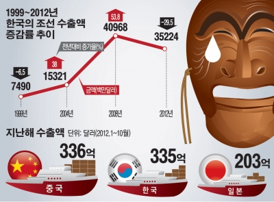 원인은 국내 조선산업이 경기침체가 극심한 유럽에 수출을 집중해왔기 때문이다. 작년 1~11월 국내 조선사의 유럽수출은 전체 수출 가운데 29.6%를 차지했다. 일본은 13.2%만 유럽에 의존했고 중국은 14.4% 수준이었다. 유럽발 경제위기에 한국 조선산업이 직격탄을 맞은 셈이다.