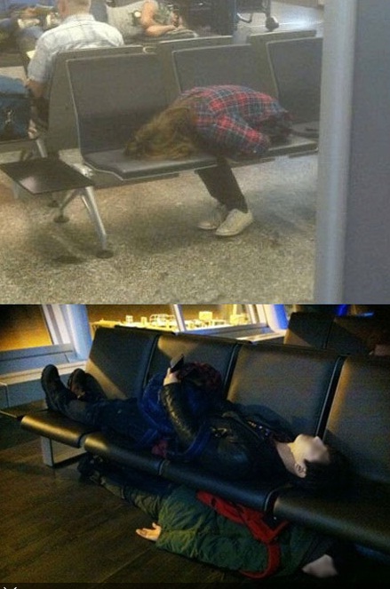또 다른 ‘공항의자에서 자는 법’ 사진은 두 명의 남녀가 공항의자 위와 아래에서 편안하게 누워서 자는 모습을 담고 있다.