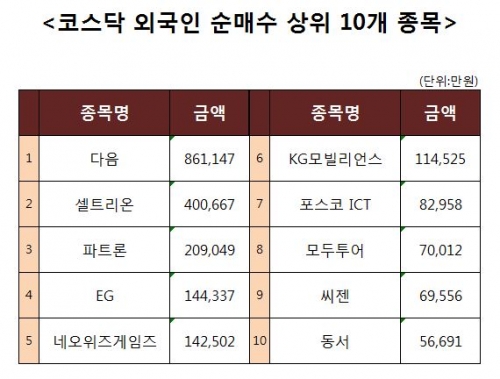 4일 코스닥 외국인 순매수 상위 10개 종목