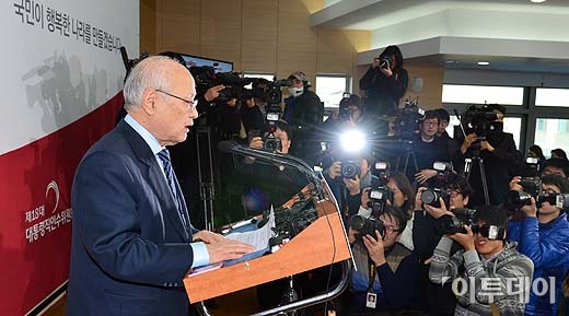 김용준 대통령직 인수위원장이 4일 오후 서울 종로구 삼청동 금융연수원에서 박근혜 대통령 당선인이 임명한 인수위원 명단을 발표하고 있다.