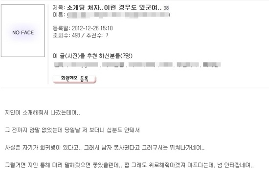 최근 온라인 커뮤니티 게시판에는 '평범한 소개팅 후기'라는 제목으로 글이 올라왔다. 평범한 소개팅 후기의 내용은, 소개팅 장소에 나갔는데 상대방이 만난지 10분도 안돼 "희귀병이 있어 남자를 사귈 수 없어요"라고 울부짖으며 자리를 박차고 나갔다는 것이다.