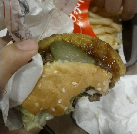 사진 속에는 햄버거 빵은 조금 남고 상대적으로 햄버거 속 재료가 더 남아 있다. 피클과 고기패티는 빵에 비해 많이 남아 네티즌들의 공감을 얻었다.