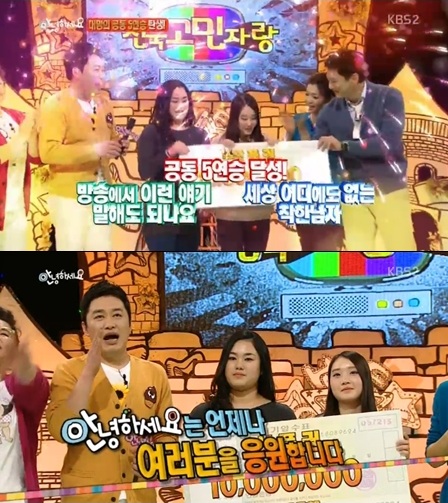 이들은 당시 방송에서 나란히 135표를 받아 공동 1위에 올랐고 5주 동안 동반으로 1위를 고수해 최초의 공동 5연승을 기록했다. 5연승은 안녕하세요의 최종 고지로 이들은 모두 우승상금으로 1000만원을 받았다.
