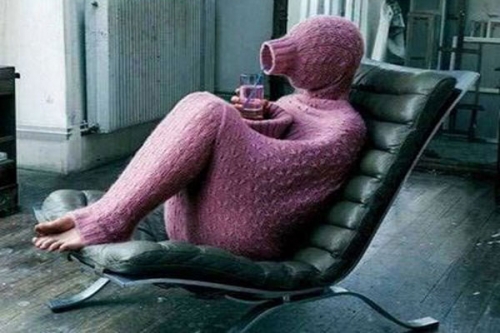 '혼자있고 싶을 때 입는 옷' 사진에는 분홍색 올인원 스웨터를 입은 사람의 모습이 담겨있다. 이 스웨터는 숨을 쉴 수 있게 얼굴 부분만 뚫려 있다. 옷을 입은 사람의 체격으로 보아 날씬한 여성만 입을 수 있는 것처럼 보인다. 특히 외계인의 모습을 상상하게 만들어 눈길을 끈다.
