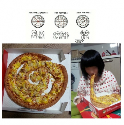 이는 ‘피자 자르는 기발한 방법’ 게시물이란 제목의 그림을 그대로 따라한 것으로 네티즌들의 시선을 사로잡는다.