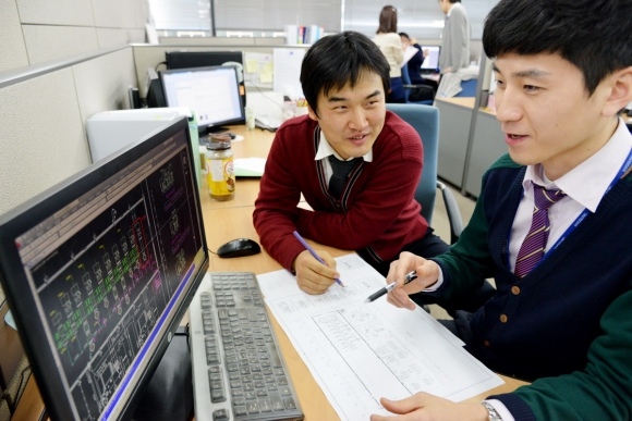▲2013년도 O.J.T 대상수상자인 중공업PG 박승호사원(오른쪽)이 지도사원 김현규과장(왼쪽)에게 업무에 대해 지도를 받고있다.