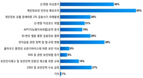 설문조사 결과 응답자의 과반수 이상인 65%는 개인정보보호법 준수가 지난해 가장 큰 화두였다고 답했다. 뒤이어 △신·변종 피싱(파밍, 스미싱 등) 증가(46%) △전자금융거래법 일부개정 등 전자금융 관련 정책 및 법·규정 변화(38%) △정보보호최고책임자를 비롯한 보안인력 수요 급증(27%) △위·변조 뱅킹 앱을 통한 금융정보 절취(26%) 등이 주요 화두로 선정됐다.