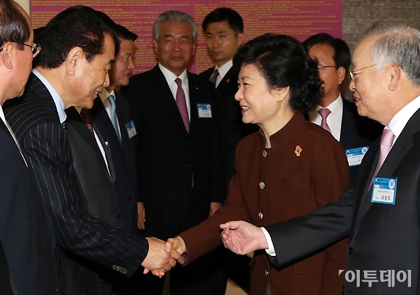 박근혜 대통령 당선인이 9일 오전 서울 남대문로 대한상공회의소에서 손경식 대한상공회의소 회장을 비롯한 상공인 대표단을 만나 악수하고 있다. 인수위사진기자단